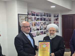 من جهته قدم سماحته درعاً تكريمياً لسعادة السفير، مشيدا بصبره وما اظهره من عزة وافتخار بالحق، اثر اصابته في عملية البيجر الغادرة، حيث امتزج دمه بدماء المجاهدين، وأشاد بدوره في إقامة علاقات على كافة الساحة اللبنانية، مؤكدا أنه طالما ان ايران ترفع لواء فلسطين ومواجهة الاستكبار، وتصدق في شعاراتها في هذا الاتجاه، فإنها أقوى من المؤامرات التي تستند على الأبعاد المذهبية أو القومية والافتراءات الفاضحة وتزوير التاريخ والوقائع الساسية المعاصرة.